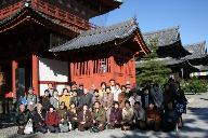 妙心寺山門、仏堂、法堂をバックに2号車の皆さん。京都スカイガイド:下村貞夫さん、バスガイドさんと共に記念写真撮影。