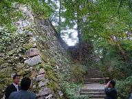 石垣の中は、大本の聖地{禁足地}になっており、「月宮宝座」の聖壇が設けられている。また写真の右端奧にちらりと見える「大公孫樹」は、樹齢400年の神木(明智光秀の手植えと伝えられ)、亀岡城跡のシンボルとなっています。