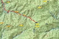 古屋集落の対岸少し先に車道のU字型カーブがあり、橋が架かり川向こうの集落に折り返している。この橋から林道が延びている。林道終点から山道にはいるが、うっかり直進すると谷を渡り名木百選「トチの大木300m」と書かれた所に出てしまう。