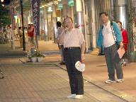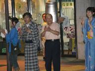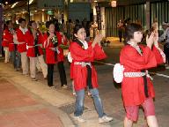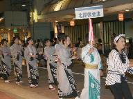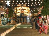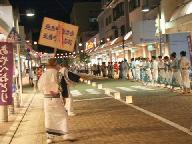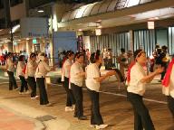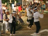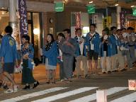 あやべの繁華街、西町アイタウンの南北の通り2区画を遮断して、東西に通る広小路-市役所前通りの西町交差点も遮断。中央に「あやべおどり」の「やぐら」と「はやしかた」を置き、通りの中心に「あんどん」を並べて、参加した18連が、その両側を「あやべおどり」をおどり周回する。見物客は両側のアーケード歩道から見る。床几を並べた観覧席もあり、松寿苑など高齢者の団体参加も見られた