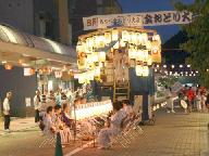 提灯で飾られたやぐらの中、歌い手と囃子方四人で