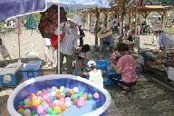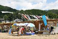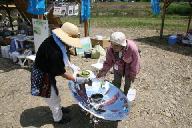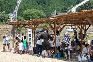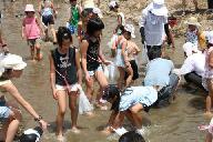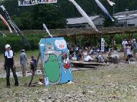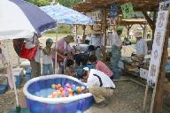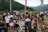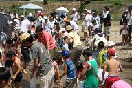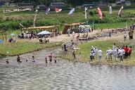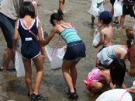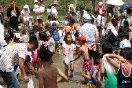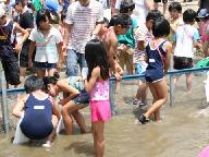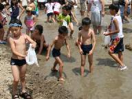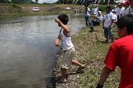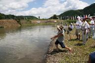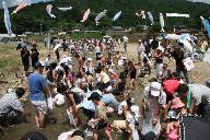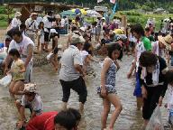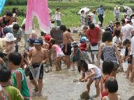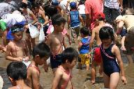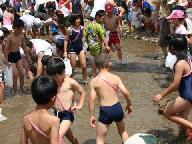 子供たちの待望の「魚つかみ」が始まった。河原に本流に沿って浅い細い川が作られ、本流から分かれた水が流れている。低い周囲の土手から出入りが自由になる。上流側には土路が作られ、下流側には板橋が渡されている。