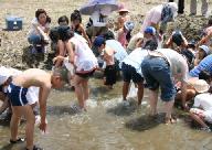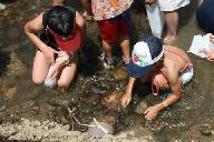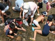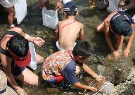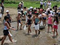 細い小川の真ん中を金網で二分して、上流側に「あゆ」、下流側に「うなぎ」が放流されている。子供たちは、川に入り、魚を追い、素手で捕まえ、袋に入れる。
