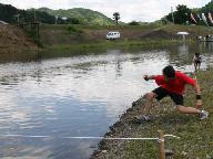 上手く投げると波紋がきれい。二本のロープからそれて出てしまうもの。跳ねさせるのに失敗するものなど、綺麗に水を切らせるのはかなり難しい。
