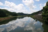 帰りは渡し舟に乗らず、簀の子張りの模擬店が並ぶ後ろの堤防を上がり、下流に架かる橋を渡った。橋の上から下流を見ると井関があり、上流の井関と、この井関に鋏まれた静水面が広がり夏雲を映し出していた。