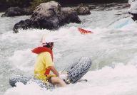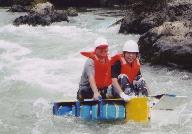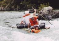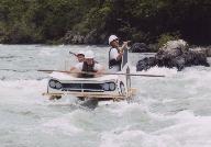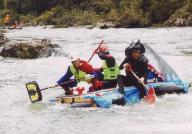 ゴムタイヤを繋いだいかだに乗った5人組、1人は川の中に落ちた?水深は背丈以上にありそう?由良川下りの出場資格は「泳げること。救命具の着用。ヘルメット着用」が義務づけられている。