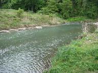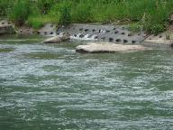 対岸まで石づたいに歩いて渡れそうで、膝上まで水を被らずには渡れない。危険を冒すよりはと、頭上の橋を歩いてわたり、対岸の斜面を下りて船を回収した。
