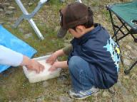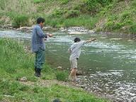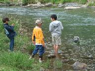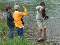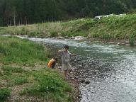 本流がある対岸近くは、かなりの水量だが、手前の河原は浅く膝下程度で子供でも楽に遊べる深さだ。