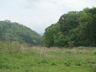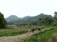 バーベキューをした上林川の河原から撮った風景。川下は上林街道が大町交差点で別れ、東舞鶴市へ行く「管坂峠(トンネル)」の道と若狭へ抜ける道に分岐する。その手前の街並みが見える。左手の山は「蟻ケ峰(419.2m)」、続く山は「蓮ケ峯(596.3m)」から「弥仙山」(664m)に続く山の一部か。手前は「管坂峠」に続く清水の山々