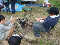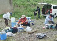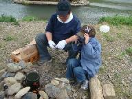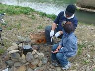 写真:上林川の橋の下、河原でバ-ベキュ-を楽しむ