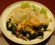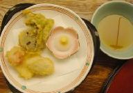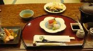 食前酒:創作日本酒・リオン 先付:桜豆腐、白魚、木の芽 八寸:葉山葵胡麻和え、貝柱百合根焼き、三色団子、菜花 造里:二種盛 煮物:筍の子、鯛の子、蓬麩、梅麩 陶坂焼:上林鶏 焼物:サ-モン木の芽焼き、はじかみ 揚物:〆鯒 香り揚げ、海老天麩羅、丸十、青唐 蒸物:茶碗蒸し 酢物:蛸酢、胡瓜、レモン 止椀:赤出汁 御食事:白御飯 香物:京漬物三種盛 水物:オレンジ