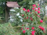 右の赤い鳥居の奧が「四ツ尾稲荷大明神大祭・柴燈大護摩供」の行われる「四つ尾稲荷神社」、左は「薬師堂」。赤いシャクナゲとツツジがきれい