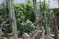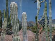このジオラマ展示は、サボテンと多肉植物の宝庫 バハカリフォルニアの植生を再現したものです。北アメリカの太平洋側に突き出たメキシコのカリフォルニア半島は、 バハカリフォルニアと呼ばれ、そのほとんどの地域が砂漠であるため、サボテンと多肉植物が良く自生し、固有種が多いことで有名です。大型のサボテンとしては武倫柱(ブリンチュウ)入鹿(イルカ)あど、その他の多肉植物としては、観宝玉(カンホウギョク)、尾紅寵(オコチョウ)などが良く知られています。