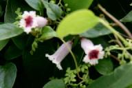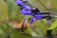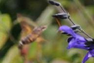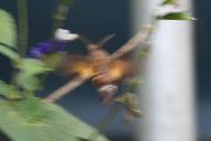 大小のある2匹のホウジャクが弾丸のごとく飛来して、互いに牽制して追っかけて追い払い、激しく羽を動かしてホバリングし、花から花へと飛び回り密を吸うと、何処へともなく弾丸の早さで飛び去る。しばらく待つとまた飛来する