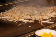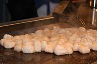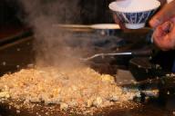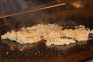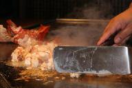C型に折れる長いテ-ブルのスタンドに座り、各自注文の飲み物が揃ったところで乾杯。料理人が二人立ち、各自の焼き加減を確かめる。私はミディアム、家内はウエルダンと注文する、初めにタマネギを二つ切りにして重ねて置き、中心にアルコ-ルを注ぎ火を付けると、白煙に包まれ猛烈な噴火を起こす。さしずめキラウエア火山のボルケィノのイメ-ジを演出。度肝を抜く。包丁を楽器替わりに撃ち合わせて鳴らしたり、ジャグラ-もどきに調味料容器をお手玉にとって、パ-フォ-マンスたっぷりの売り物料理だった