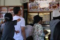 ハワイ最終の夕食に買い物をしようとアラモアナ・センタ-に歩いて出かけた。まず一階のフ-ド・コ-トに並ぶ店で食べ物を買い、広場中央に設けられた席について食事。私はいつもの通り、カツカレ-にした。