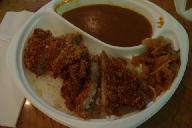 ところがカレ-が深い容器に入っていて、ご飯と混ぜられない。こんなのは初めてだ(笑い)カツやご飯をカレ-汁に浸して食べて問題解決。食べ方にも工夫がいる(笑い)