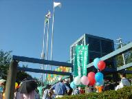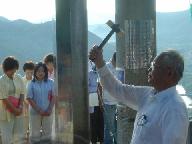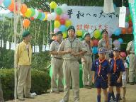 飛ばす予定の市民から寄せられた「平和への想い(メッセ-ジ)」をつけた風船が準備されている。平和公園の「平和の鐘」建造物の梁を利用したもので見栄えは良かったが、風が吹くと風船の水素の浮力が減じ、この枠から脱落、脱出して大空に順次旅立ってしまう曲者。式典の間中、ひどいトラブルを起こしていた