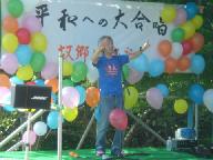 手話を組み込んだ歌を披露。会場の聴衆も参加して、ユキヒロさんの指導に従い手話の勉強。最後にユキヒロさんの歌われるリフレインの部分に歌と手話で参加し、力強い平和の歌声が山上いっぱいに広がった。