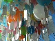 風船には「平和へのメッセ-ジ」や願い事を書き込んだ「メモ」が下がっている。