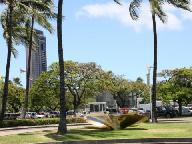 宿泊したハワイ・プリンス・ホテル・ワイキキから歩いて散歩に出た「アラモアナ・ビ-チ・パ-ク」 「マジック・アイランド」で。シャワ-の樹