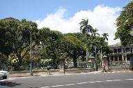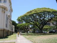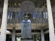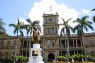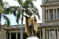 ハワイ統一を成し遂げたカメハメハ大王の銅像。1883年のカラカウア王の戴冠式の日に除幕された。以来、100年以上に渡ってイオラニ宮殿を見守っている。後ろの古い建物はアリ・イオラニと呼ばれる裁判所(Wikipedia辞典より)