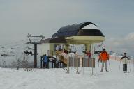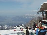 ファンタジー・クアッド・リフト1560mに乗り、スキ-ジャム勝山ファンタジ-サイト頂上:標高1240mに10時に立つ。眼下に福井平野と山々の宏大な景観を見下ろす。好天気で雪質も固く閉まり申し分なし。ここからファンタジーAコース1620m(初・中級)、およびファンタジーBコース1330m(中級)を一気に滑り降りる。豪快な気分だ