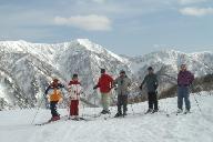 スキ-ジャム勝山イリュ-ジョンサイト頂上リフト1320mで写真を撮った後、Fさんと2人でファンタジ-・アクセスコ-ス830m(初・中級)の稜線を滑り、ファンタジ-サイトの頂上リフト1240m近くを経てファンタジ-ブラザに戻った。今夜は白峰温泉泊まりなので4時半までスキ-を楽しみ、一行15名が揃ったところで集合写真を撮り、一度ファンタジ-ペアリフト209mに乗り標高960mから一気に麓のリゾ-トセンタ-までのバラエティコ-ス1670m(中・上級)を滑り降りた。ゲレンデの最下部にブッシュが見られたが積雪は充分にあり、素晴らしいスキ-の今日一日の締めくくりとなった