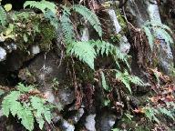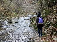 谷は川筋をS字型にうねるように流れるので交互に深いよどみがあり、川岸を詰めて遡上すると急峻な崖で行く手を阻まれる。そこで対岸に渡河する訳ではあるが、時には急峻な崖をへつるように巻いて渡りきる必要な場所がある。かなり崖の上部までせり上がり巻いた方が安全ではあるが、また立木や岩につかまり足場を確保しながら、川辺をへつり渡りをする場合もある。家内はふじもと様に靴の袋を持っていただき渡りきった。私もカメラを首から提げて両手を自由にして渡り始めたが、どうもカメラが揺れ邪魔だ。下がった木の枝やツタをくぐり抜け、かわす必要もある。見かねたふじもと様がカメラを首から抜き取り持っていただいた。その後はカメラを腰に巻いたポ-チ・バックにしまい行動した。