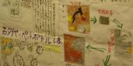 通路の両側には「環境子ども作品コンク-ル」で表彰を受けた7校の作品・壁新聞が一面に張り出されていた。