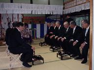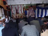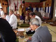 次に膳にゆずの実大根赤とうがらし等のきったものをのせ、それを肴に、ひらわんのふたに神酒をつぎいただいて、当年自治会長講元、次年自治会長講元の順で、それぞれ挨拶があり終る。次に次年度講元の家へ宮司を先頭に行列をととのえ徒歩で行き遷座式を行う