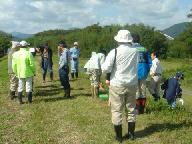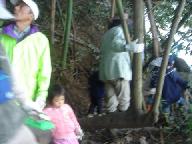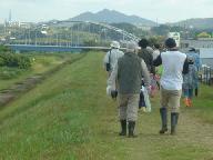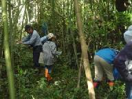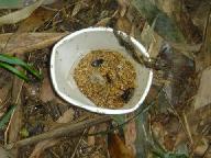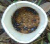 うっそうと茂り混み合った由良川河川敷に広がる「明智藪」に、細い通り道を切り開き通路に沿って、前日にこのような紙コップに餌を入れた「ワナ」が50個ばかり仕掛けられている。餌は、さなぎの粉、バナナ、コ-ラの3種類。