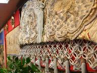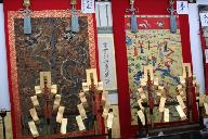 水引は、つづら織りの名手とうたわれた西山勘七作の唐子遊図、前掛は、牡丹・胡蝶図と雲龍文との三枚継ぎ、胴掛は、雲龍波涛文の綴織。見送は二種あり、袋中上人請来と伝える朝鮮軍旗、竜文のものを三枚合わせ、淵を赤地古金欄(安楽庵製)で縁どったものと、中国の明朝の官工場で織られた紅地唐美人図の綴織とがあり、二つを一年交替に用いている。京都市