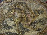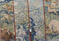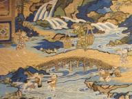 子供が川で遊んでいる大きな織物の中央部の図柄