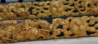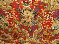 水引は,雲龍文様の繻珍(しゅちん)。前掛は伝萬歴帝御服(でんばんれきていぎょふく)(1989)復元。胴掛は百華文の綴錦。見送は宝暦十四年(1764)記銘の牡丹鳳凰文様綴錦(ぼたんほうおうもんつづれにしき)と紅地唐子遊図(べにじからこゆうず)の二種類が隔年交替で用いられる。