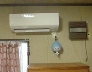 北向きの窓の上、屋外換気扇と並んでついている。室外機はこの窓の右、屋根の上にきっちり納まった。「ぴちょんくん」が、ぶら下がっている。