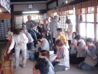 白い祭幕の張られた本殿・権殿参拝の入り口。参拝者はその手前の廊下に上がり下足を預け、白い襷を首に掛け左手の控え室に入っていく。2号車一行は入ってかなり時間が経つがまだ出てこない。心配そうに幕の前で待つ四方事務局長。案内をしていただいた祢宜さまが出てこられたが、交代で入る肝心の1号車の会員の姿がない。