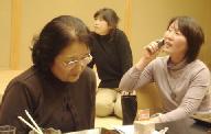 写真:携帯電話で答えを質問者と相談するS夫人。早速木製のパズルに取り組むA夫人