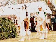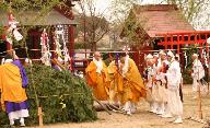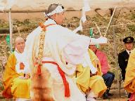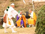 僧侶の皆様、テントの来賓席には消防の方、自治会の代表など。赤い消防自動車が坂道を上がっていったので、何事か心配して聞く方がおられたが、火難よけなど除災祈願が行われるので毎年お見えになり「火わたり」をされている