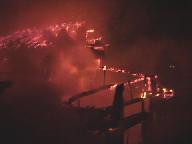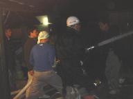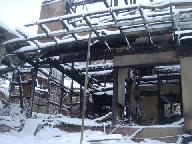 かなり下火になったが尚、炎上中の家(三棟)と消火作業を撮った。
