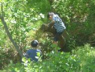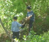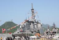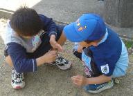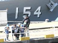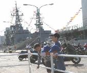 桟橋の海の生物に興味があるのか一心に覗き込んでいる。大きな「ボラ」が群をなして自衛艦と桟橋の間を泳ぎ回っている。反対側には「ヒトデ」「アメフラシ」「イソギンチャク」「クラゲ」・・などが一杯見える。海上自衛隊の中なので誰も採らない。