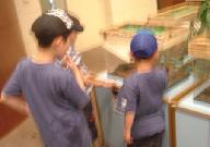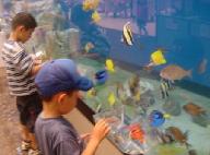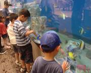 中からお姉さんが出てこられ、小エビの入った容器を配っていただく。どういう仕組みか餌口が水槽の底部に設けてあり、そのポケットに餌を入れると魚が食べに出てくる。子供が腕を水槽の中に入れても水はあふれない。