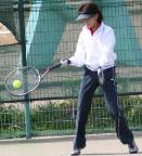 テニス教室の初日はストロ-クの練習が主。フォアとバックの両方をマスタ-していく。最初の定位置からサイドに移動して、コ-チが出したボ-ルを打っていく。打ち終わると元のスタ-ト位置に戻り繰り返す。つまりじっと立ったまま鬱のでなく、ボ-ルまで走り構えて打つ。