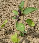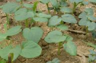 「オクラ」の苗。種を播いて子葉が出たところ。これから本葉が出てくる。多少直根性なのか、大きくなると移植できない。小さい内に移植するが、降雨で土か跳ね上げられて茎につくと枯れてしまう。小さい内は、降雨対策が必要。