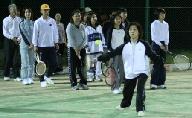 綾部テニス協会のテニス教室が、毎週水曜日に、綾部工業団地内の高倉公園テニスコートで、夜7時から夜間照明で行われる。40名の予定人員に対し、56名の参加があった。初心者から中級まで3クラスに分け、コート3面を使い10回の講習。雨天の場合は翌週に順延される。