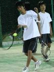上級コースの高校生たちと一緒にバックハンド・ストロ-ク。