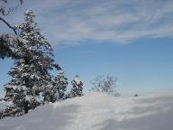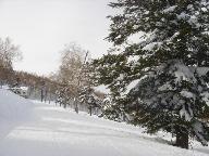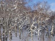 ツア-最終日は、ふじもと様の写真撮影のお供をして、谷筋を回りました。処女雪の写真を撮られる予定でしたが、殆どの森の奥まで人が入り、雪面を荒らしているので失望しました。細い白樺林の木立の陰、雪を被った樹氷の立ち並ぶ森、雪面に出来た風紋・・光と陰の光景を、逆光を上手く使い撮影する極意を、ふじもと様から教わりました。