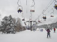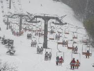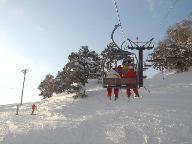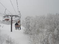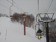 麓から乗り継いだ2本目の長いリフト。平行するシングルリフトは、座席に雪を積んだまま使われていない。その左に続くゲレンデは、緩斜面コ-ス。