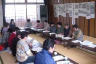 阪神大震災の記念日前で、昨年の台風23号被害が綾部でもあり、引き続いて越後の震災、スマトラ沖の地震津波で防災意識の高まる中で、大勢の自治会長、市議会議員、消防署長など多数の参加があり、上原幸一自治会連合会長から、真っ赤な防災要員用のヤッケを提示しながら、防災訓練で全地域住民の参加が得られた話などあり、熱心な討議が行われた。その後、篠田神社境内で放水の消防訓練が行われたと市民新聞に報道されていた。