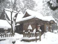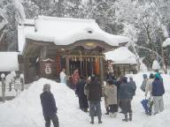 3日朝は、前夜の積雪が踏みしめられて氷結した上に、薄く新雪が舞う最悪の路面となり、テカテカ、つるつるの道を中学生が滑りながら登校する有様で、急坂でトラブリ、タイヤチェンを付けて金河内まで走行することとなった。遅刻する旨を梅垣正一志賀郷地区自治会連合会長に電話し、着いたときは10時半前で「茗荷田」の刈り取りは終わっていて、拝殿の前に一同が集まられ、大志万昌次宮司から「茗荷占い」の解説を聞かれているところであった。 降りしきる雪の中でお祓いが行われ、登尾峠の登山などでお世話になった相根良一志賀郷和会長などの皆様、梅垣和夫体協評議員(テニス)など知っている地元の方々とお会いし、甘酒の接待をいただいた。